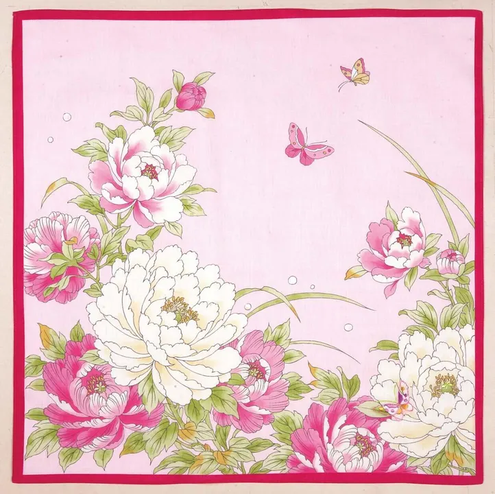en.gawa.(エンガワ)ハンカチ 古くから日本家屋で親しまれてきた「縁側」。縁側から見える庭の風景、その庭に咲き乱れる季節の花々を描いた、艶やかで美しいハンカチです。 牡丹と蝶々 春を代表する花「牡丹」と、その周りを飛び回る「蝶々」を刺繍で表現しました。 サイズ・容量 約 48 × 48 cm 規格 ■生産地:日本 ■素材・成分:綿 100%(60ローン生地) ■パッケージ:基本:10枚1袋入 ■商品札:有り 注意事項 生地の色はお使いのパソコンモニター・メーカーや機種の画面設定により、実際の商品の色とは異なってみえる場合がございます。予めご了承ください。 300枚以上のご注文はメッセージよりお問い合わせください。