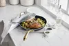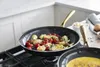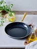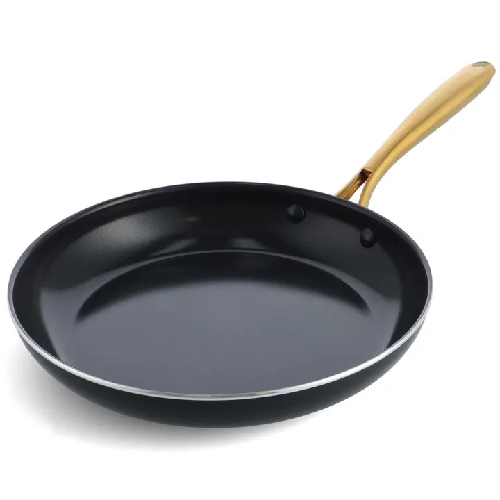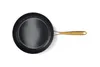 ノンスティック・セラミックコーティングが施され、熱伝導に優れたこびりつきにくいフライパンです。丸みのあるハンドルは中空になっているので軽く調理やお手入れをしやすい点も嬉しいポイントです。ブラックのボディとゴールドのハンドルの上品なデザインは調理後そのまま食卓にサービングするのもおすすめです。