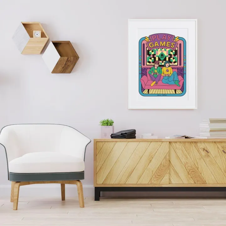アーティスト -PROFILE- Satomi Kawai(サトミ カワイ) イラストレーター&グラフィックデザイナー 女子美術大学デザイン学科卒業 デザイン会社での勤務経て2015年フリーランスに。 ちょっとシュールで小洒落たイラストを描いています。 【作品について】 TVゲームをする時の楽しさを表しました。 作品名:PLAY GAMES 手法:イラスト、デジタル ペーパー:高品質半光沢紙 マットカラー:白 マット*:DXホワイト芯 100%バージンパルプ/PH7・中性紙(2mm厚) ※全てのアートにマットがつきます フレームカラー:黒、白、無垢(3種類から選択) ※マット付のため通常とはフレームサイズが異なる規格となります。 【マット*とは?】 アートポスターの周りに挟んだ厚紙の事。 マットを使わない時に比べ余白により広がりが生まれ、作品の新たな一面を引き出せ作品の見栄えがグッと良くなります。また、額縁のガラス面と作品が直接触れたままにしておくと、くっついて作品を傷つけることがあります。マットを使用することでガラスと作品の間に空間ができ、作品を保護することができます。ブランドコンセプトにより全てのアートにマットがつきます。 ー ファッションのようにアートを ー 私達が掲げるコンセプトです! 毎日着替えるファッションの様に、アートも気軽に飾り変えて欲しい... 一旦飾り終えたアートにも光を当ててほしい... ポスター単体、またはリピートで中身だけのポスターを購入された方に"専用のハンガー"をセットでお届け。 「今までに無い!新しいアートの飾り方を提案」 飾る事がなくなった前のアートをハンガーにかけて洋服と一緒にかけてもらう。 その日の気分や、モチベーションですぐに取り換えられる様に。 もちろん、魅せる収納としても今までにないおすすめの飾り方です。