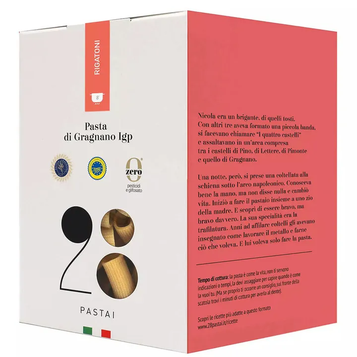 【イタリア版ミシュランGambero Rossoガンベロ・ロッソ TOPイタリアンフード受賞 プロが認める逸品】 ◎イタリア版ミシュランとも称されるレストラン格付け「Gambero Rosso(ガンベロ・ロッソ)」にて、栄誉ある「TOP ITALIAN FOOD賞」を受賞。 その味は、イタリア国内の著名なガストロノミーでも採用されており、プロからも高く評価される折り紙付きの逸品です。 ◎使用する素材はすべて無農薬。さらに、パスタの聖地グラニャーノ産で、PGI(地理的表示保護)認定を受けた品質です。 ◎各パッケージには、ブランド名の由来となった28人のパスタ職人たちの似顔絵とエピソードが描かれており、物語性あふれるデザインが魅力。  洗練されたビジュアルとストーリーが融合したおしゃれな仕上がりで、ギフトにもぴったりの逸品です。 ◎原産国 イタリア ◎ソースがよく絡むブロンズダイス製のパスタを使用。マカロニよりも太く、ソースが良く絡むのでラグーソースなど、濃厚なソースとの相性が良くアマトリチャーナでもよく使われます グラニャーノパスタのIGP認定を受けたもちもちで良質なパスタ 職人の手による伝統的なパスタを製造している小さなパスタ工場、28PASTAIは1934年にイタリア、グラニャーノの渓谷に誕生しました。 農薬不使用のイタリア産デュラム小麦を使用して作られたパスタは、イタリアの美食家たちをも納得させる、深い味わいを誇ります。