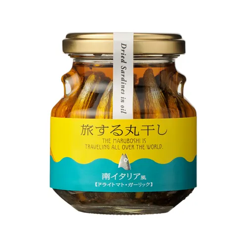 老舗の干物屋がたくさん残っている全国でも珍しい町、鹿児島県阿久根市。 この港町で漁師たちが朝方4時から6時に獲ってくる「ウルメイワシ」は、おなかの中にエサが残っていないので苦みが少なく、食べやすい干物になります。 お酒のアテのイメージが強い丸干しですが、時代の流れと共にライフスタイルも変わり、今では食卓で丸干しを見ることは随分なくなりました。 それでも「丸干しの良さを守りたい」と、朝どれの美味しい丸干しを世界の国々の味をイメージしたオイルに漬けました。 南イタリア、プロヴァンス、マドラス、阿久根…まるで日本の丸干しが世界をわたり歩いているような風味が丸干しの旨味と共に口の中に広がります。 創業昭和14年の下園薩男商店が提案する干物の新しい形です。 製造は手作業。じっくりと干され旨みが凝縮した丸干しは、より食べやすく頭としっぽを切り、一尾一尾製造スタッフが丁寧に瓶の中に詰めていきます。少しでも力の加減を間違えるとほろりと崩れてしまう丸干しを傷つけることなく、隙間なく瓶に整然と詰めていくのは一朝一夕でできることではありません。美味しい丸干しをより多くの人に知って食べてもらい、手に取ってくれるお客様の豊かな生活の一つに加われたら。そんな想いと共に丁寧に一尾ずつ詰めています。 ~南イタリア風~ 南イタリア風は、ドライトマト、フライドガーリック、唐辛子、黒こしょう等を入れた、南イタリアを感じさせるようなピリッとスパイシーな味付けで、幅広い層に人気のある商品です。 パンやパスタとの相性はもちろん、ビール、ワインにも合い、さまざまな料理に使用できます。 時間を問わず、メインにも軽食にもおつまみにも。 風味豊かなオイルは、オイルパスタやドレッシング、ソースなどに使っても美味しく召し上がれます。 ※写真は盛り付けイメージです。丸干し以外の食材等は販売物に含まれません。 ~活用レシピ~ ●丸干しパスタ フライパンに丸干しのオイルと瓶の中のドライトマト、鷹の爪、丸干しを入れて炒めます。パスタのゆで汁を適宜加えてソースを作り、パスタに絡めて完成です。塩味はお好みで。 ●旅するブルスケッタ フランスパンに切った丸干しをのせ、お好みでチーズやプチトマトをのせます。トースターで焼きあげたら仕上げに瓶のオイルをかけて完成です。 ●旅するカナッペ クリームチーズと丸干し、オイルをフードプロセッサーにかけ、フランスパンに塗ります。丸干しとハーブをトッピングして完成です。