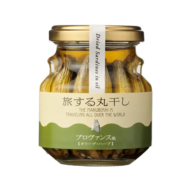 老舗の干物屋がたくさん残っている全国でも珍しい町、鹿児島県阿久根市。 この港町で漁師たちが朝方4時から6時に獲ってくる「ウルメイワシ」は、おなかの中にエサが残っていないので苦みが少なく、食べやすい干物になります。 お酒のアテのイメージが強い丸干しですが、時代の流れと共にライフスタイルも変わり、今では食卓で丸干しを見ることは随分なくなりました。 それでも「丸干しの良さを守りたい」と、朝どれの美味しい丸干しを世界の国々の味をイメージしたオイルに漬けました。 南イタリア、プロヴァンス、マドラス、阿久根…まるで日本の丸干しが世界をわたり歩いているような風味が丸干しの旨味と共に口の中に広がります。 創業昭和14年の下園薩男商店が提案する干物の新しい形です。 製造は手作業。じっくりと干され旨みが凝縮した丸干しは、より食べやすく頭としっぽを切り、一尾一尾製造スタッフが丁寧に瓶の中に詰めていきます。少しでも力の加減を間違えるとほろりと崩れてしまう丸干しを傷つけることなく、隙間なく瓶に整然と詰めていくのは一朝一夕でできることではありません。美味しい丸干しをより多くの人に知って食べてもらい、手に取ってくれるお客様の豊かな生活の一つに加われたら。そんな想いと共に丁寧に一尾ずつ詰めています。 ~プロヴァンス風~ タイム、セージ、フェンネルなど、プロヴァンス地方でよく使われるようなハーブをブレンドしたエルブドプロヴァンス。そのハーブとブラックオリーブをオイルに入れて煮詰めました。爽やかな香りで丸干しがすっきりとした味わいになります。 白ワインにも合うおいしさで、ニース風のサラダにぴったりです。丸干しにオリーブを添えてお召し上がりください。 時間を問わず、メインにも軽食にもおつまみにも。 風味豊かなオイルは、オイルパスタやドレッシング、ソースなどに使っても美味しく召し上がれます。 ※写真は盛り付けイメージです。丸干し以外の食材は販売物に含まれません。 ~活用レシピ~ ●丸干しのニース風サラダ 旅する丸干しのオイル小さじ2、酢小さじ1、塩ひとつまみを混ぜ、ドレッシングを作り、くし切りのゆで卵、トマト、ブラックオリーブ、ゆでたジャガイモ、レタス等のサラダに丸干しを皿に盛り、ドレッシングをかけて完成です。冷えた白ワインやロゼと一緒にどうぞ。 ●旅するカナッペ クリームチーズと丸干し、オイルをフードプロセッサーにかけ、フランスパンに塗ります。丸干しとハーブをトッピングして完成です。 ●丸干しのバーニャカウダ 旅する丸干しのオイル大さじ1とマヨネーズ大さじ1を混ぜ、アスパラガスやパプリカ等、お好みの野菜をつけてお召し上がりください。市販のバーニャカウダソースと丸干しをフードプロセッサーにかけても美味しいソースが完成します。