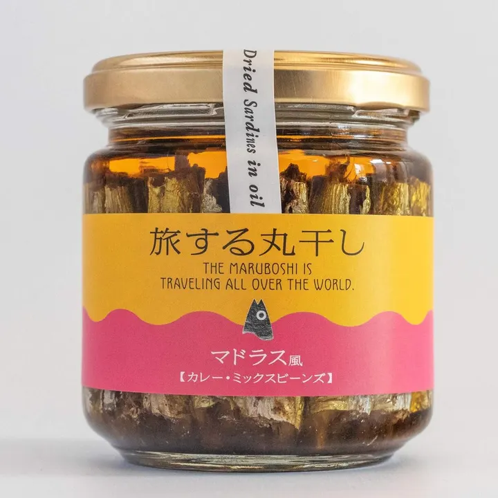老舗の干物屋がたくさん残っている全国でも珍しい町、鹿児島県阿久根市。 この港町で漁師たちが朝方4時から6時に獲ってくる「ウルメイワシ」は、おなかの中にエサが残っていないので苦みが少なく、食べやすい干物になります。 お酒のアテのイメージが強い丸干しですが、時代の流れと共にライフスタイルも変わり、今では食卓で丸干しを見ることは随分なくなりました。 それでも「丸干しの良さを守りたい」と、朝どれの美味しい丸干しを世界の国々の味をイメージしたオイルに漬けました。 南イタリア、プロヴァンス、マドラス、阿久根…まるで日本の丸干しが世界をわたり歩いているような風味が丸干しの旨味と共に口の中に広がります。 創業昭和14年の下園薩男商店が提案する干物の新しい形です。 製造は手作業。じっくりと干され旨みが凝縮した丸干しは、より食べやすく頭としっぽを切り、一尾一尾製造スタッフが丁寧に瓶の中に詰めていきます。少しでも力の加減を間違えるとほろりと崩れてしまう丸干しを傷つけることなく、隙間なく瓶に整然と詰めていくのは一朝一夕でできることではありません。美味しい丸干しをより多くの人に知って食べてもらい、手に取ってくれるお客様の豊かな生活の一つに加われたら。そんな想いと共に丁寧に一尾ずつ詰めています。 ~マドラス風~ ガラムマサラ等スパイシーな香辛料、唐辛子、黒こしょう入りのオイルで、丸干しの旨味がグッと引き立つ本格的なカレー風味です。 食感が楽しいミックスビーンズ入りで、ビールやジントニックなどカクテルが進む味わいになります。カレーやピラフとの相性抜群です。 時間を問わず、メインにも軽食にもおつまみにも。 風味豊かなオイルは、オイルパスタやドレッシング、ソースなどに使っても美味しく召し上がれます。 ※写真は盛り付けイメージです。丸干し以外の食材は販売物に含まれません。 ~活用レシピ~ ●丸干しベジナン ナンやパンの上にアスパラガスなどの野菜と丸干しをのせ、瓶の中のミックスビーンズを散らし、パルメザンチーズを振ってオーブンで焼きます。最後に旅する丸干しのオイルをかけて完成です。 ●マドラスのジャガイモ炒め 皮をむき、水にさらしてアクを抜いたジャガイモと丸干しをお好みのサイズに切り、旅する丸干しのオイルと一緒にフライパンで炒めます。お好みで塩こしょうとバジル等をかけて完成です。 ●炊飯器で丸干しのカレーピラフ 炊飯器に洗米したお米2合と水を適量入れ、丸干し8本、オイル大さじ3、ミックスビーンズ適量、有塩バター5g、塩ふたつまみを入れて炊飯します。炊き上がったら少し蒸らし、全体をよく混ぜれば完成です。