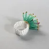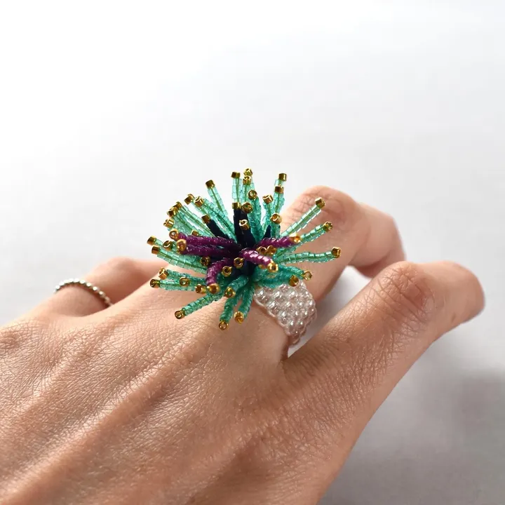 幾重にも重なって生えた葉があたかも仏の座 蓮台を連想させるホトケノザ その中心には 赤紫色の鮮やかな花が ぴょんぴょんと飛び出している 愛らしさと神聖さを併せ持つ魅力的な草花です material ガラスビーズ、金糸、フェルト、ゴム *ゴールドビーズは本金メッキ加工を施したものを使用しております size モチーフ約Φ23x25mm、指まわりフリー(約9号〜) *伸縮性のあるゴムを使用しているためフリーサイズでお着用いただけます weight 約5.08g *CACICOの商品は全て1点1点制作しているため、個体差があり、商品写真と差がある場合がございます。ご了承の上、ご購入ください。 *金属アレルギーの方はご使用をお控えください *受注生産のため、ご注文確定後1週間〜10日以内に商品を発送いたします