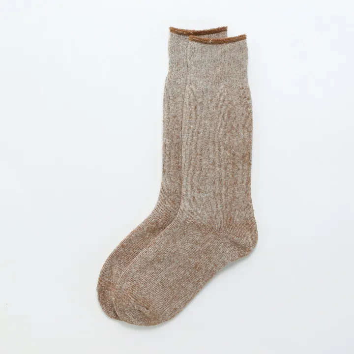 エコというものが取り組みからブームとなってしまった現代、 何が正しいのかを見失いがちになります。 地球にやさしく、お洒落を楽しむ。 足元から見直そうということで、リサイクルコットンを使用したシリーズを作りました。 廃棄される衣料や生産背景に残ってしまった糸や生地を色ごとに集めて、 もう一度ワタにし、新たな糸へ蘇らせています。 その際に一切の水を使用することなく、二酸化炭素の排出も限りなく少ない。