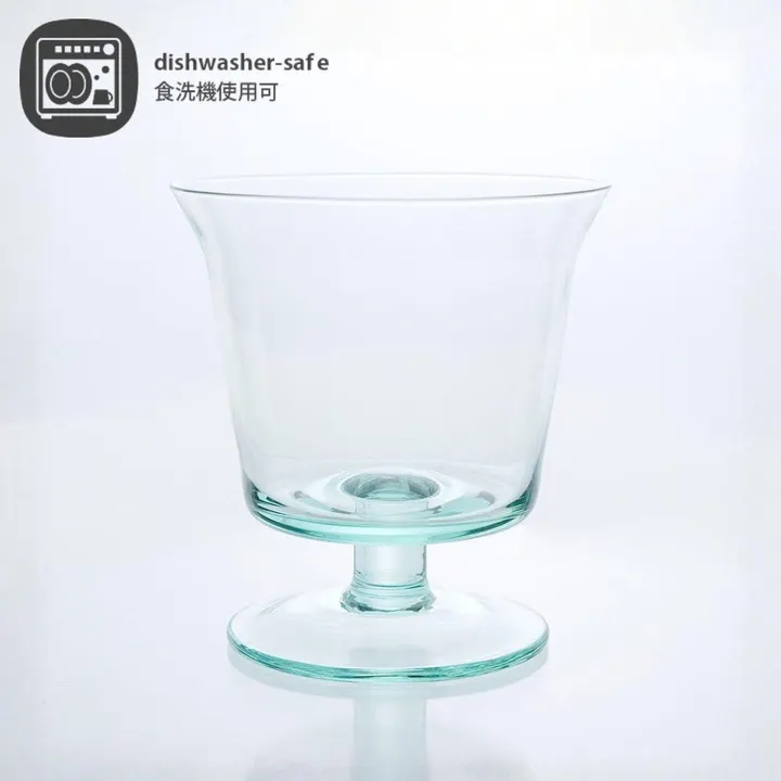 再生ガラスで作られたリューズガラスシリーズは素朴な風合いが特徴です。 ヨーグルトやコーヒーゼリーを入れたり、小さなパフェを作ってみたり。 大きすぎないサイズ感は、朝食や食後のデザート用として最適です。 リューズガラスとは、再利用されたガラスのことをいいます。一般的には「リサイクルガラス」や「再生ガラス」とも呼ばれ、一度は捨てられたり不要になったガラスをリサイクルして使っています。そのためリューズガラスは、環境にやさしいサスティナブル(Sustainable=持続可能)な社会への取り組みとしても注目されています。リューズガラス製品は、ひとつひとつが職人たちの手によるハンドメイド。炉で溶かしたガラスを竿ですくい取り、型の中で息を吹き込みながら作る「型吹き成形」という技法で作られていますので、たとえ同じ型のシリーズであっても、全く同じ仕上がりになるということはありません。ハンドメイドならではの、ガラス表面に生まれるわずかな“しわ”や小さな気泡、繊細な表情の違いなどをお楽しみいただけると思います。さらにリューズガラスの風合いは、無機質な印象になりがちなガラス製品に独特のあたたかみや素朴さをもたらしてくれます。吹きガラスならではの、やや薄くて軽い作りも魅力のひとつです。