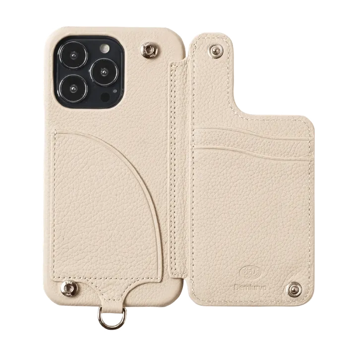 2023年9月より弊ブランドはDemiurvo(デミウルーボ)改めDEMIU(デミュウ)に改名いたします。 それに伴い、DEMIUの名を配したブランドネーム・ロゴが採用されます。 一部商品に関しては、Demiurvoとして引き続き販売いたしますが順次モデルチェンジ予定です。 何卒、ご理解のほど宜しくお願い致します。 カラー豊富なお財布機能つきiPhoneケースPOCHE(ポシェ)。 選び抜かれた上質なフランス産牛革を使用したiPhoneケース。 本革を使用しているため、ひとつひとつとして同じ革がないところも魅力。 思わず目を惹かれるカラーと質感で存在感抜群のアイテムです。 右扉の内側に2段のカードスリットと隠しポケット、左側に収納ポケット、 外側に小銭入れを施しお財布としての機能を備えた便利なアイテム。 蓋をささえにして横置きできるのでYouTubeやテレビ会議にも便利。 ショルダーなどを付けられるリングが付いているので、別売りのショルダーストラップとのセットや色違いのストラップでコーディネイトするのもおすすめです。※iPhone12 miniおよび13miniの背面のカード入れに関してですが左側(ケース装着側)の仕切り部分と、右側の裏ポケットにはカードはお入れいただけません。右側のカード入れにはカード段が1つの仕様となります。ご注意ください。 ※ストラップは別売りです。 ー仕様ー・素材本体:牛革ケース部分:ポリカーボネート金具:ニッケル・重量約65g
