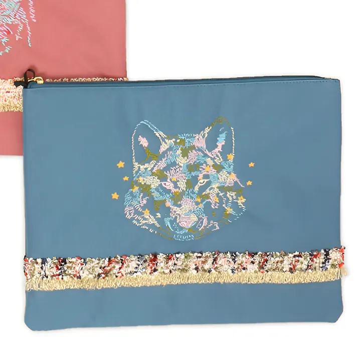 鮮やかな刺繍で描かれた動物が愛らしいシリーズ。 かわいいだけではなく、機能性も兼ね備えたアイテム達は、ワンランク上の旅を嗜む女性にぴったりです! 大きめサイズのポーチはクラッチとして持ったり、タブレットやラップトップケースとして最適です。 ※正規の電子機器ケースではございませんので自己判断の上ご使用ください。