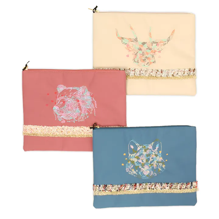 鮮やかな刺繍で描かれた動物が愛らしいシリーズ。 かわいいだけではなく、機能性も兼ね備えたアイテム達は、ワンランク上の旅を嗜む女性にぴったりです! 大きめサイズのポーチはクラッチとして持ったり、タブレットやラップトップケースとして最適です。 ※正規の電子機器ケースではございませんので自己判断の上ご使用ください。