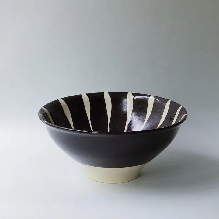 陶器の柔らかい土感に黒の化粧土を施した凛麺丼。白い十草の部分は撥水を掛ける事で、優しい土色とのコントラストがモダンなどんぶりです。白湯スープの白や坦々麺の赤色のスープを引き立て食欲をそそります。 ■鈴木陶苑 土岐市下石 親子二代に渡りこつこつと陶器を焼き続けている窯元です。温かみのある淡い土色をした生地に粉引や黒十草・三島・塗り分けなどの多種多彩な技術と手仕事を施しています。丁寧に一点一点製造される器は、温かみにあふれています。