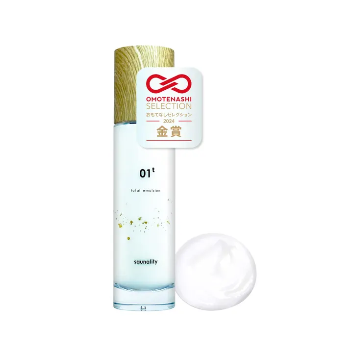 これが、saunalityのトータルケア。 サウナスキンケアの定番。 01t トータル乳液は、美白有効成分のプラセンタエキス*1、抗炎症成分の甘草由来エキス*2、そしてIPMP*3を配合した薬用乳液です。 この3つの有効成分が、シミやそばかすだけでなく、にきびや肌荒れ、風呂上がりの気になる汗臭などの肌トラブルをトータルで防ぎます。 お顔だけでなく、全身やVIO*4にも使用できるため、サウナやお風呂上がりの綺麗な素肌を潤いで満たし、透明感あふれる肌へと導きます。 ヒアルロン酸と水溶性コラーゲン*5を配合しており、しっとりとした保湿効果をもたらしながら、後に使用するクリームの邪魔をしないサラサラとした使い心地に仕上げました。 さらさらとした使用感と爽やかなお茶の香りで、心地よいスキンケアタイムをお楽しみいただけます。 *1 美白有効成分;ニチレイ・水溶性プラセンタエキスB-M。メラニンの生成を抑え、しみ、そばかすを防ぐ。 *2 抗炎症有効成分;グリチルリチン酸ジカリウム。 *3 殺菌成分;イソプロピルメチルフェノール。 *4 VIOゾーンに使用する際はあらかじめ少量でテストを行い、粘膜や敏感な部位へのご使用を避けてください。 *5 保湿成分