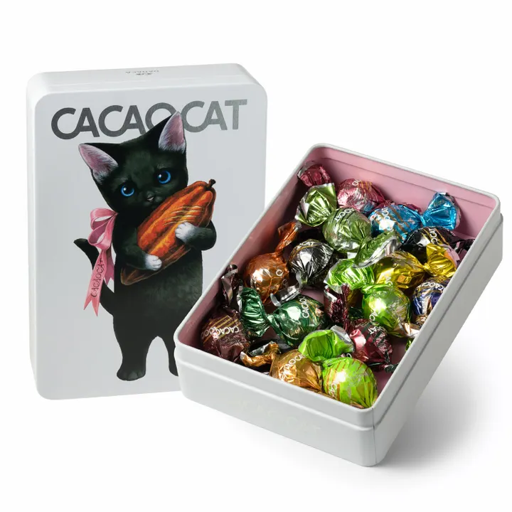 カカオポッドを持った猫のイラストが特徴的なCACAOCAT缶。 更に美味しくリニューアルしました。 CACAOCATの洗練されたデザインは、猫を愛する人へ贈るギフトにもぴったり。 〈アーティスト・木原 未沙紀さん×CACAOCATのコラボパッケージ〉 主に動植物をモチーフとしたイラストレーション作品を制作。 「空想の肖像画家」と呼ばれる彼女の描く動物たちには、気品にあふれ、人々を惹きつける魅力があります。 究極の滑らかさと素材にこだわり抜いた、北海道産のプレミアムチョコレート。 それが、CACAOCAT(カカオキャット)。 あの人の笑顔を想像して、愛と平和と美味しさを込めて。