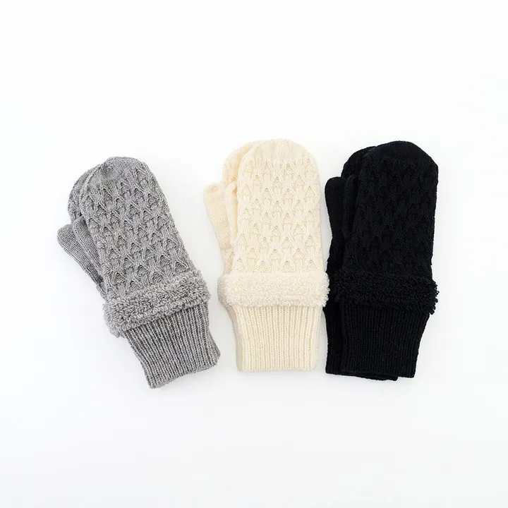三角地模様とループ編みを組み合わせた、表情豊かなミトン。3種の異なる編み柄が織りなす繊細なデザインが魅力です。ふんわりとした温もりに包まれながら、冬のおしゃれを楽しめるアイテム。大切な人への季節のギフトにもぴったりな、あたたかみ溢れる手元のアクセントです。 ウールは暖かく吸水性、吸湿性に優れた天然素材です。一方のアクリルはウールに似せて作られた合成繊維で、ふっくらとやわらかく保温性、耐久性が高く、乾きやすさが特徴です。ウールには縮み、アクリルには吸水性、吸湿性が低いなど、それぞれにデメリットもありますが、合わせることによって弱点を補った素材になっています。