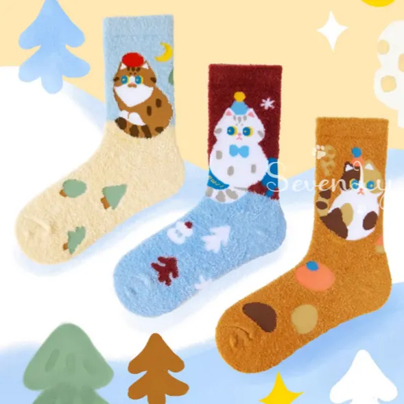 【2025秋冬新作】猫イラスト もこもこルームソックス 3足セット『MEWJIミャオジ』 靴下☆インテリア |画像の色 (1組3足) 5点セット