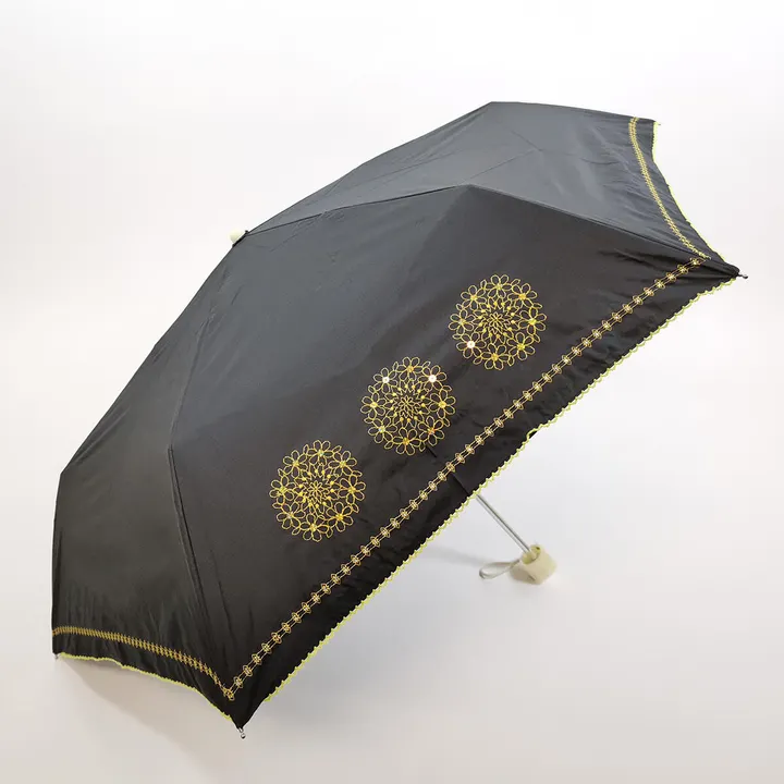 UVカット&完全遮光 遮熱 ターキッシュフラワー刺繍 晴雨兼用3段折りたたみ傘 27515 ブラック