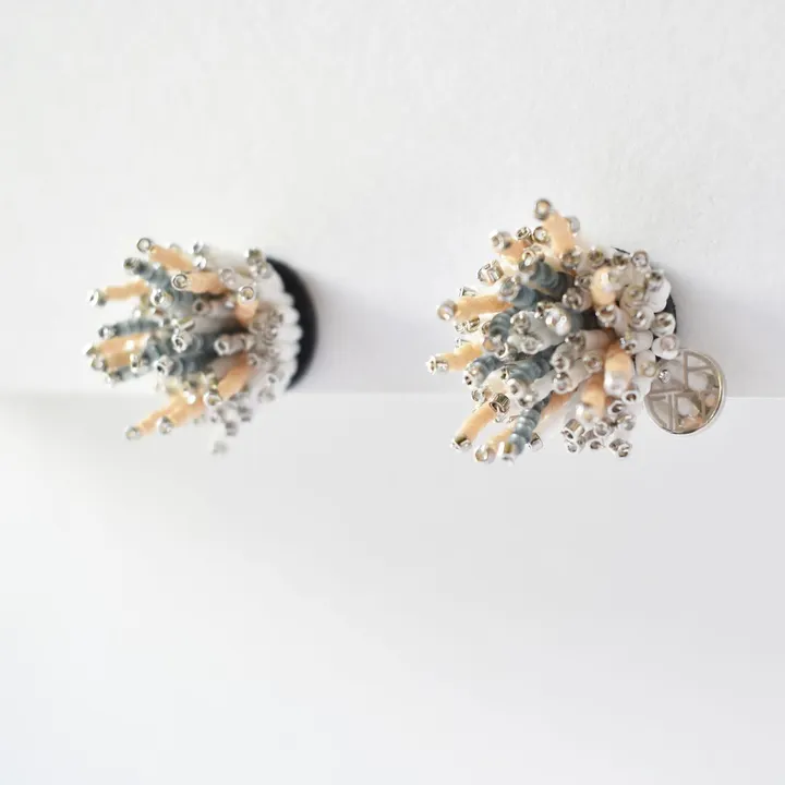 秋が訪れ静けさの漂ってきたころに咲くオケラ 頭花は枝に頂生し 二列に並んだ針状に羽裂する 魚の骨のような苞葉に包まれながら アザミに似た筒状の小花が密生する その花姿は誠実で愛らしく 何か考えさせられるように こちらをみつめています *こちらの商品は、お客さまの耳の形状やピアスホールの位置によっては、装着位置がご満足いただけない場合がございます。 material SILVER925(ピアス金具)、ガラスビーズ、銀糸、真鍮、チタン、フェルト、本革 *シルバービーズはパラジウムッキ加工を施したものを使用しております *下地カラーはベージュに変更しております size 約Φ23x18mm weight 約3.1g *CACICOの商品は全て1点1点制作しているため、個体差があり、商品写真と差がある場合がございます。ご了承の上、ご購入ください。 *金属アレルギーの方はご使用をお控えください *受注生産のため、ご注文確定後1週間~10日以内に商品を発送いたします