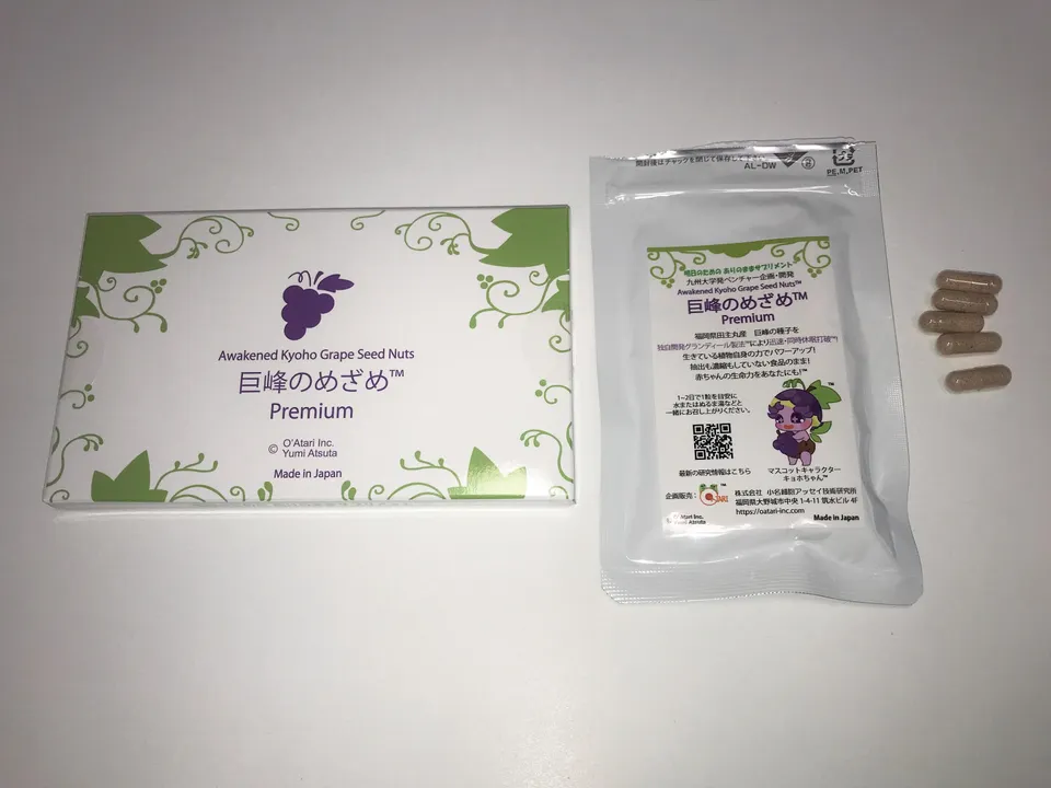 九州大学発ベンチャー企画・開発 抽出も濃縮もしない食品のままでパワーアップに成功! 「明日のための ありのままサプリメント™」 巨峰ブドウの捨てられる種を利用した環境に優しいサプリメント。 自分の中の違和感をなくしたい方、今日のだるさを明日に残したくない方、朝から夜までパワフルに活動したい方、頭のモヤモヤを晴らしてスッキリしたい方、お花のムズムズを軽くしたい方、お肌を若々しくしていたい方に絶対飲んで欲しいサプリです。 ブドウは、紀元前3,000年からカスピ海沿岸やコーカサス地方で栽培され、長い生産と食習慣の歴史を持ちます。種の中身も食べられてきました。 巨峰の種を独自開発グランディール製法™により5日以内で迅速・同時にめざめてもらい、赤ちゃんの生命力部分である種の中身を取り出しました。その後乾燥しました。 年齢とともに低下していく若々しさや、健やかさ。これをブドウの赤ちゃんの生命力が、体本来の力に働きかけ、若々しく、健やかな人生のメンテナンスのお手伝いをします。 巨峰ブドウ発祥の地、福岡県久留米市田主丸産で、生果の巨峰の種のみを使用しています。安心して飲み続けて頂くために、厳選したおいしい食材を、契約農家さんから入手し、ご提供しています。 愛するワンちゃんにもどうぞ! 名称:巨峰種子胚乳含有食品 原材料名:巨峰種子胚乳末(国内製造)、乳糖/結晶セルロース、HPMC、グリセリン脂肪酸エステル、二酸化ケイ素、リン酸カルシウム(一部に乳成分を含む) 内容量:8.85g(295mg×30粒) 賞味期限:2025.01 栄養成分表示(1粒0.295gあたり):熱量 1.254kcal、タンパク質 0.012g、脂質 0.032g、炭水化物 0.229g、食塩相当量 0.0003g お召し上がり方:1~2日で1粒を目安に水またはぬるま湯などと一緒にお召し上がりください 保存方法:直射日光及び高温多湿の場所を避けて涼しいところに保存してください 販売者:株式会社 小名細胞アッセイ技術研究所 福岡県大野城市中央1-4-11筑水ビル4F 製造所:占部大観堂製薬株式会社 福岡県直方市大字知古1761-74 注意:・原材料をご参照の上、食品アレルギーのある方はお召し上がりにならないでください。・妊娠、授乳中の方、乳幼児及び小児は摂取しないでください。・薬を服用中あるいは医療機関にかかっている方は、医師や専門家にご相談ください。・天然物由来の原材料が含まれるため、色調等にバラツキが出る場合がございますが、品質には問題ありません。・1回に必要以上の量を召し上がられることは、おやめください。・体質や体調によりまれに体に合わない場合があります。その場合はご使用をお控えください。・開封後はチャックをしっかり閉めてお早めにお召し上がりください。・食生活は、主食、主菜、副菜を基本に、食事のバランスを。