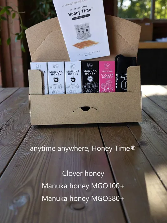 HoneyTime® 5g携帯用生はちみつは、お客様のご要望から産まれた商品です。 外出先で、手軽なマヌカハニー、飴よりも即効性のある生はちみつマヌカハニーをなど様々なご意見を頂戴しました。    ***** マヌカハニーとは、マヌカは標高1km以下のニュージーランドのみに自生し、11月から1月ころ梅に似た花を咲かせる木花。抗菌性と花粉荷の濃厚な味わいを保つ、天然そのままの非加熱はちみつ。そしてクローバーはちみつもグリフォサート(農薬)ゼロの馴染みのある癖のないはちみつです。 マヌカハ二―MGO100+は普段使いとして、マヌカハニーMGO580+はかなりハイレベルの抗菌性も持ち合わせていますので、いざという時にご活用いただけます。 充填方法は、秋田県角館町の自社工場により、一切加熱をせず部屋を温めるなどしゆっくり時間をかけて充填しています。粘性も高く濃厚すぎるゆえに小さいものには充填しずらくなりますので、他社では加熱し栄養価も抗菌性も阻害され水あめのようになったものを充填しているのが主流のようです。それでは天然のはちみつのままとは言えません。 こだわりのポイント -----------------------------------------------------------------------------------    非加熱の生はちみつ代表格マヌカハニーとクローバーが携帯用に    anytime anywhere, HoneyTime! いつでもどこでも生はちみつ!  ----------------------------------------------------------------------------------- 個包装5gはゴミが土に還ることを考慮に余分な印刷をなくし管理コードのみのとしました。 栄養価や抗菌性の特質を生かすために特に非加熱充填に拘り、 咽喉のケア、アスリートフードとしてもエネルギー補給(砂糖の多糖類と違い、生はちみつはエネル ギー化し易い単糖類)、肌用パック、オリゴ糖で脳の癒し効果でホットミルクなど、いつでもどこでもご活用頂けます。 お砂糖代わりに生はちみつをいつでもどこでもご活用いただけます。 PBeesオリジナル巾着つき、持運びに便利です。(色は選べません) ★こんな方におすすめ ・飴を舐めすぎて更に水分が必要になるので生はちみつにしたい ・何も喉を通らない! いざというときのハイクラスのマヌカハニー ・太り過ぎを気にしているが糖を摂らないと頭が働かない ・喉がイガイガする ・コーヒー・紅茶に手軽に入れたい ・クエン酸と相性のいい良質のマヌカハニーを持ち歩いて、レモンに入れたい ・マヌカハニーをいつも携帯したい ・高温加熱の飴より、生はちみつを常備したい ・歯磨き粉の代わりに使いたい ・集中力をつけたい ・疲れたときに体を温めるとき生姜に入れて飲みたい ・すぐエネルギー化する生はちみつを摂りたい ・石鹸や肌のパックに使えるから携帯したい、PBeesのかな。 ・とにかく便利だから良質のマヌカハニーを携帯したい ・砂糖に変わる自然な糖類を手軽に摂りたい ・昔からある自然の糖で免マヌカハニー