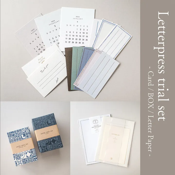 ”活版印刷 文具お試しサンプルセット” 活版カードサンプルセット+BOXサンプルセット+レター商品サンプルセット すべてが詰まったサンプルセットです。 活版印刷の質感を見てみたい方、書き心地を試してみたい方、ぜひ実物をお試しください。 内容: [活版カードサンプルセット] ・TLP CALENDAR (2025年のもの) × 3枚 ・TLP message card × 2枚 ・LETTER PRESS BOX × 3枚 ・冬限定LETTER PRESS BOX × 5枚 [BOXサンプルセット] LETTER PRESS BOX 【message card】× 1 LETTER PRESS BOX 【memo】× 1 [レター商品サンプルセット] 【OLIVE GREEN】+【GOLD】のセット ・LETTER WRITING PAPER 【OLIVE GREEN】 × 1 ・TLP LETTER SET 【GOLD】 × 1 ※写真はイメージです。 ※カードの柄等はランダムです。