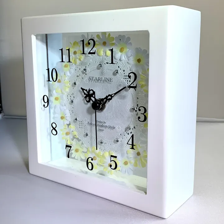 3枚のクリアなガラスにレースペーパーとスープリームホワイトの造花を挟んだ、かわいくておしゃれな置き掛け兼用時計です。 たくさんの可愛らしい小花がガラスいっぱいに広がり、爽やかさと同時に豪華な空間を演出します。 どんなインテリアにも調和し、日常を彩るアートピース。時間の経過を優雅に告げるこの時計は、目にするたびに笑顔を運びます。 リビング、寝室などはもちろん子供部屋でも可愛い! 後ろのフックを壁に固定したら、壁掛け時計としてもお使いいただけます。 母の日、誕生日、開店祝い、記念日など様々なシーンのプレゼントにも最適です。 ぜひこの機会にご利用くださいませ。