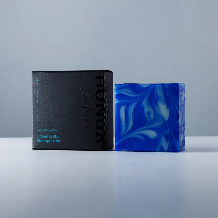 沖縄諸島に属する島で、最も西に位置する島、久米島の深度612mからくみ上げた海洋深層水を配合したシャンプーバー 毎日のシャンプーや、頭皮のスペシャルケアのための石けん(枠練製法・コールドプロセス) HONUA Surfriderの石鹸は、毛穴の汚れ・頭皮洗浄にこだわったシャンプーバーです。 本島から西へ100km離れた久米(くめ)島は、琉球諸島の中でも「球美(くみ)の島」と称される美しさで人気の離島。 その美しい海の深度612mから日本最大級の施設にて海洋深層水が汲み上げられ、養殖業をはじめタラソなどの医療、精製し食塩や飲料水などに活用されています。 研究の結果、清浄で小クラスター、豊富な栄養素、人の体液と同じミネラルバランスなどの特徴が分かってきたその海洋深層水由来の水をベースに、手間を掛けきれいなマーブル(スワール)模様を施したこの石鹸は、大変心地よくなめらかでやさしい、ほんのり青色の泡立ちが特長。 また、素地に使う植物オイルにもこだわり、オレイン酸を多く含む良質のピュアオリーブ油、リノール酸やビタミンB・Eなどが豊富なスイートアーモンド油、ホホバ油など、 通常は少量配合で用いられるオイルを贅沢に使用することで、若々しく柔らかいしっとりした美肌を導きます。 その高い美肌力と保湿力のおかげでつるつるすべすべした洗い上がり、まるでむきたてのゆでたまごを思わせるハリ・ツヤ、透明感あふれる健康的な肌にきっとご満足いただけます。見た目は少し派手かもしれませんが、厳選素材の持つ確かなスキンケア力が魅力でもある石鹸です。 【ベースオイルと主な効能】 ・ピュアオリーブ油:保湿、皮ふの保護 ・パーム油 :潤い、泡持ち ・ホホバ油 :保湿、整肌、ハリ、老化防止 ・スイートアーモンド油:皮膚に浸透し柔らかく、乾燥肌対策 ・ココナッツ油: クリーミーな泡 【ご使用上の注意】 1. タオルや泡立てネットをご使用の際、一時的に石鹸の色が付着する場合がございます。洗い流せば落とせますが、気になられる方はご留意ください。 2. 目に入ったときはすぐに水で洗い流して下さい。 3. お肌に合わないときはご使用をおやめください。 4. 保管の際は、直射日光を避け、涼しい場所に保管して下さい。 5. 手作り石鹸特有の“色むら”や若干のキズ・汚れ、表面に結晶化した成分の斑点などが見られることがございますが、品質には問題ございません。 6. 手作り石鹸にはグリセリン(保湿成分)が多く含まれている為、比較的溶けやすくなっております。使用後に水切りをしていただければ、型崩れを防ぐことができます。 7. 幼児の手の届かないところに保管して下さい。