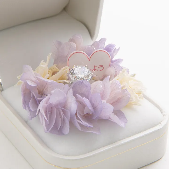 ※プリザーブドフラワーは生花に特殊な加工を施し、枯れる事がなく数年美しい状態を楽しめる素材です。ドライフラワーは自然の花・葉などを乾燥させた素材です。どちらも保存状態により多少の色変わりがございます。 ※配送の際、稀に微量の素材塵がでる可能性がございます。お手数ですが、遠目からドライヤーの弱冷風を当てたり、ティッシュなどの柔らかい布等で吹き払ってください。 ※高温多湿の場所で保存しますと、他所への色移りの恐れがございます。プロポーズ前・特にプロポーズ成功後はフタを開けて保存いただきますよう、お願いたします。 ※リースは繊細な作りとなっておりますので、リングケースの開閉等のお取り扱い際には、充分にご注意ください。 ※シルバー商品は空気中に含まれる成分・汗などに反応し、変色する特性がございます。月に一度ほど柔らかい布で拭くなど、お手入れください。 ※ネットでの販売はご遠慮ください。