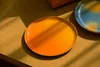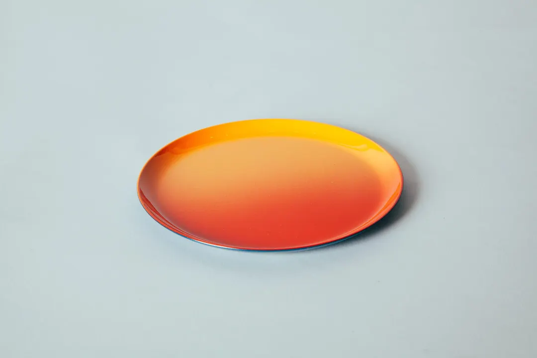 橙のグラデーションを表にした小物置きにも使えるお皿です。 石川県加賀市の加佐の岬から見る夏の終わりの夕焼けが反射して海の色と混ざり合ったデザイン。橙のグラデーションと海に差し込む光の変わり塗の両面塗装となっています。