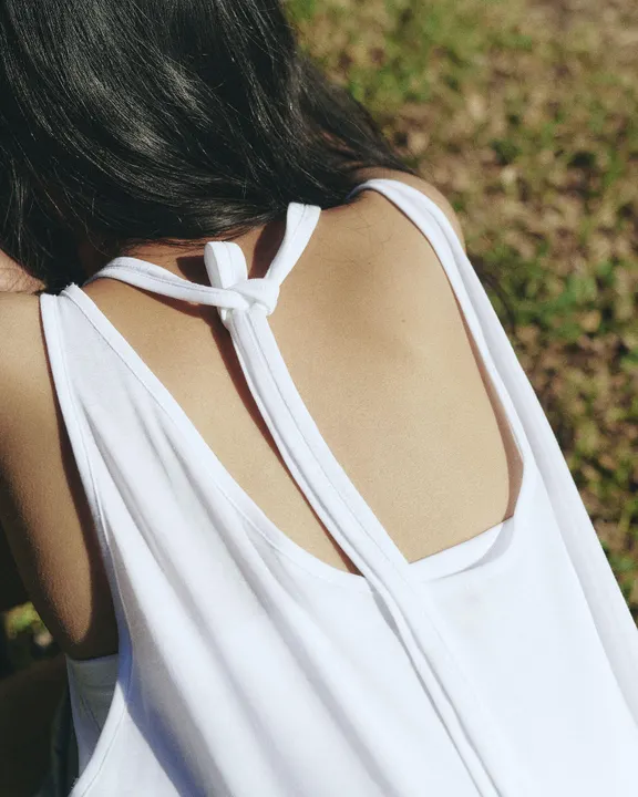 上質で膨らみのある風合いと毛羽感の少ない強撚フライスコットンを使用。 2枚のタンクトップをレイヤードさせたデザインで、ネックや裾にかけて重なり合った仕上がりが特徴です。 レイヤードされているインナーのショルダー部分がストラップになっており、背中で結ぶことでデザインが完成します。 ストラップは⻑めの設定していますので、結ぶ位置によりインナーの見え方や後ろからの見映えに自在な変化をつけることができます。 また、ネックやアーム周りのバインダーも極限まで細くすることにより、繊細でカジュアルになりすぎない見た目に仕上げています。 裾も⻑めにし両脇にスリットを入れていますので、インせずに出して着用するのがオススメです。