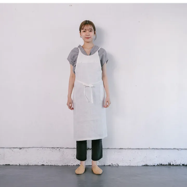 リネン白・ユニフォーム ユニフォームとしてリネンの白は、活躍してくれること間違いなしです スッキリとしたベーシックエプロン  どなたにも合わせやすいエプロンです 首紐は結んでお使い頂けますが、肩が凝るという方のために、後ろクロス使いができるようにしています どちらでも使い方は自由です