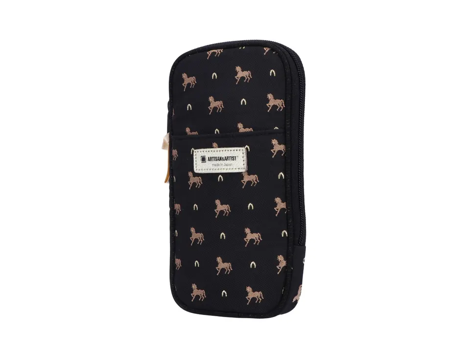 クラシカルな馬柄と蹄鉄のモチーフのカラーリングにこだわった、ブランドオリジナルデザインのシリーズ。 気品漂う馬柄をブロンズカラー、その馬柄の目と蹄鉄をゴールドラメ、蹄鉄のモチーフの先端にライムグリーンを使用。裏地には蹄鉄の先端のライムグリーンに合わせて、同系色のミントグリーンを採用し、シックなデザインに明るいカラーが彩をもたらしています。古くから幸せのシンボルとして親しまれてきた、馬や蹄鉄のモチーフをあしらった魅力的なポーチです。 ちょっとした外出用のコスメ収納や、小物の整理に便利なポーチ。3面にわたって開くL字型ファスナーは中のものの取り出しもスムーズ。 わずか20mmという薄さながら、メイク道具を2~3個入れたり、鍵とカード類を入れたりと、使い道はたくさん。バッグ内の整理にも便利です。 中には分割ポケットも付いており、ペンシルやマスカラなどスティックアイテムもきちんと収まります。 外側のポケットは、出し入れの多いアイテムの収納におすすめです。