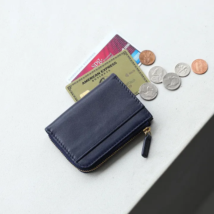 【ガバッと開いて視認性◎】レザーコインケース 薄型 L字ファスナー 小銭入れ / CC7 ネイビー × ネイビー