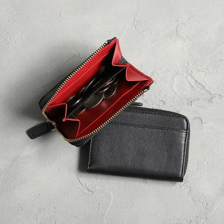 【ガバッと開いて視認性◎】レザーコインケース 薄型 L字ファスナー 小銭入れ / CC7 レッド × ブラック