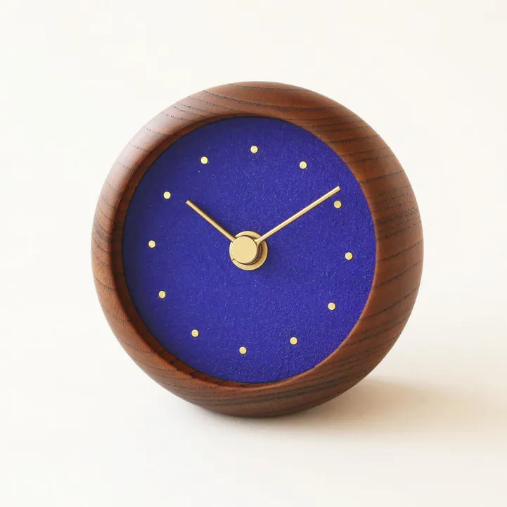 文字盤にアズライト(和名:藍銅鉱)という鉱物を砕いた粉末(岩絵具)を塗りました。 飛鳥時代に日本に岩絵具が伝わってから、約1400年間ずっと変わらず使い続けられてきた、日本美術を代表する色彩です。非常に高価な絵具で、江戸時代は金より高値で取引されたと伝えられています。 本体は、漆器の産地として400年以上の歴史を持つ石川県加賀山中の「ろくろ引き」という、回転する木に鉋(カンナ)を当てて形作る方法で製作しました。 素材はケヤキで、木目が美しく、なめらかでしっとりとした質感です。 文字盤は、下地に金沢市二俣町で和紙作りをされている、石川まゆみさんに漉いていただいた和紙を使用し、 その上に天然石を砕いて作られる「岩絵具」を幾重にも塗り重ねています。インデックスは金沢の金箔です。 ■木の部分の色は、プレーン・ブラウン・ブラックの三色をご用意しております。 ■裏面カバーにオリジナルの刻印を入れることができます。(有料 +880円税込) ■受注生産のため、基本的にご注文いただいてから約2週間のお時間をいただきます。ご了承ください。 【時計部分の仕様】 ・日本製・1年保証・本体のサイズ:直径10cm厚さ5.4cm・使用電池:単3形乾電池 【付属品】 ・単3乾電池1個・取扱説明書1部・牛革製裏面カバー