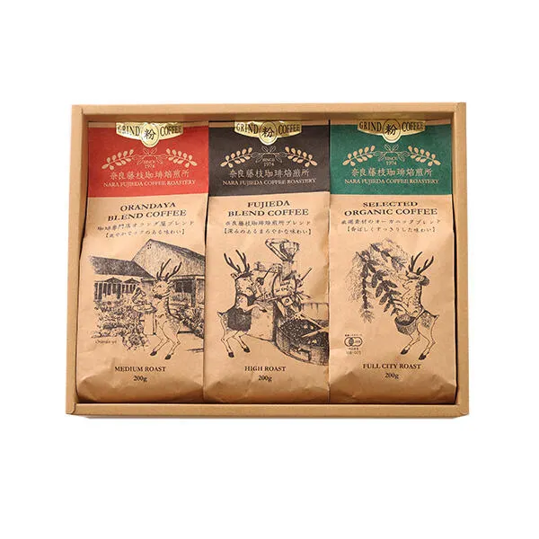 『奈良藤枝珈琲焙煎所』のオリジナルギフト 焼きたての新鮮な珈琲豆、粉のギフトセットです。本格的な味や香りを楽しめる自家焙煎珈琲を専用のギフトBOXでお届けします。 ギフトBOXサイズ:高さ83mm、幅296mm、奥行235mm
