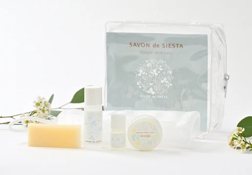 『旅行用にも、お試し用にも。 シンプルスキンケア 4アイテムをミニサイズで。』 石鹸、化粧水、美容オイルとマッサージスクラブ。 私たちSAVON de SIESTAがおすすめするシンプルスキンケアは、「簡単で嬉しい!続けられる!!」とお声を多くいただくシンプルな4ステップで、お肌本来の力を引き出します。 まずは2週間。SAVON de SIESTAのシンプルスキンケアをトータルでお試しいただけるセットです。旅行用のトラベルセットとしてもどうぞ! ●セット内容 ①素肌をきれいにする「雪肌石鹸」 酒粕を配合し、しっとりつるつるに洗い上げる洗顔石鹸です ②肌質を整えるマッサージスクラブ 砂糖でできた、敏感肌の方にもお使いいただける、お肌に優しいシュガースクラブです。古い角質がとれつるつるでもっちりとした洗い上がりはとにかく驚きと感動! ③お肌の潤いを補う化粧水 お肌に浸透していくのがわかる、さらりとした使い心地の化粧水です。天然由来成分100%、ヒアルロン酸の6倍の保水力のあるサクランを配合。 ④お肌を乾燥から守るモリンガオイル モリンガの実からとれる「モリンガオイル」100%。べたつかず、お肌を柔らかくし、ハリと艶を与えてくれるオイル美容初めての方にも使いやすいオイルです。
