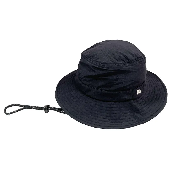 腰部分に国旗の刺繍が入ったナイロン生地のサファリハット。帽子の裏側は通気性とかぶり心地を重視したメッシュ素材。フェスやアウトドアに最適なあご紐を搭載したアイテム。