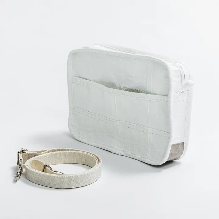 このショルダーバッグは5枚の牛乳パックを使用しています。 革を鞣したような風合いのデザインに仕上げています。 全てのパーツに紙パックを使っており、本来の防水機能そのまま。 底にはスエードを使って補強することで見た目はリサイクルと感じさせず、スエードのカラーは紙パックにマッチしたナチュラルなカラーを4つ選びました。 長さが調整可能のショルダーベルト付で、斜め掛けも可能です。 内側と外側にそれぞれポケットを装備しています。 一つ一つ丁寧に製作する為大量生産はできず、そして紙パックの各銘柄もそのまま生かすことで、世界でたった一つのデザインバッグとなっています。 (写真にある内装の紙パックの銘柄はイメージ写真となります。) 【マテリアルインフォメーション】 サイズ: 巾22.5㎝×高16.5㎝×奥行4㎝ ベルト: 150㎝ 重さ : 122g + 75g(ベルト) 本体  : 紙パック       スエード(グレージュ) ※使用する紙パックにつきましては再利用での活用である為、組み合わせのご希望には対応することは出来かねません。 大変申し訳ございませんがご了承ください。 【色について】 商品写真はできる限り実物の色に近づけるようにしておりますが、お使いのモニター設定、お部屋の照明等により実物の商品と色味が異なる場合がございます。 【お取り扱いのご注意】 〇汚れた時は、食器洗い洗剤などを生地に浸みこませて拭き取り、その後水拭きをしてください。 〇先端のとがった物や、カッター等の刃は商品を傷つけ、破損の原因となります。 〇火気のそばには置かないようにご注意ください。