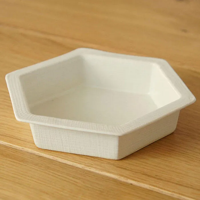 陶器なのに、まるで木製のような軽さと風合い。どんな食材でも美しく映える薄手のお盆のようなお皿です。 布目とよばれる技法を使い、表裏とも木綿豆腐のような型押しが見られます。 薄くて軽いので取り扱いには少し注意が必要です。しかしその分繊細で丁寧な仕事を感じることができます。 菓子皿に最適なお皿が2サイズ、総菜などが美味しく見える六角鉢も2サイズ、それぞれ3色のお色がございます。 美濃の窯元で丁寧に作られた逸品です。
