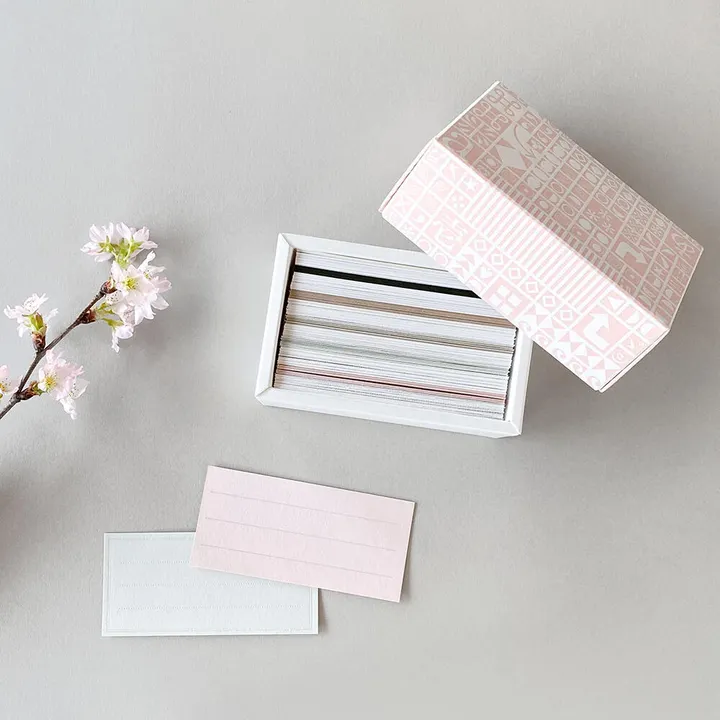2026 【Spring limited】 LETTER PRESS BOX 春限定の淡くやわらかなカラーリングのBOX。 桜をイメージした爽やかで温かみのある差し色は、春の麗らかな空気を感じさせます。可愛らしすぎない大人な桜色は、日々の中でささやかな彩りを添えてくれます。 『LETTER PRESS BOX とは?』 活版印刷の余り紙を捨てるのはもったいない!という気持ちから生まれたメッセージカードです。箱は活字をイメージしたモノグラム柄で活版の凹凸を存分に楽しめます。箱を開けるとアンティーク調のデザインカードが、たっぷりと150枚程度入っています。手触りや書き心地が異なる、種類豊富な紙をお楽しみください。 ※商品のスペック、カードの紙の種類は予告なしに変更する場合があります。※写真はイメージとなります。 【SIZE】 BOX:W112×H72×D57㎜ CARD:W93×H44㎜ 100seets over 【PRINT】 BOX:活版印刷1色 (桜色) CARD:活版印刷1色 (ホワイト / ライトグレー / ネイビー)