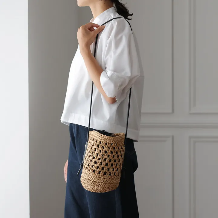 撚りの少ないフラットなラフィアのようにも見えるペーパーコードを使い、ショルダーバッグに仕上げました。筒型なので見た目以上の容量です。涼し気な透け感もを楽しめる編みに。巾着ポーチは取り外し可能なのでお好きなハンカチやスカーフで目隠ししたり、お気に入りのアイテムをのぞかせたり、アレンジ自在です。 ペーパー素材とは紙のことで、紙繊維を糸状に撚ったものです。撚ることで密度が高まり、十分な強度を確保することができます。軽くて丈夫な素材で、帽子やバッグなど様々なアイテムに使用されています。紙は空気を通しやすく、通気性にも優れています。染色もしやすく、天然素材では難しい豊富な色展開や発色が可能な事も特徴の一つです。 *ポーチ取り外し可能