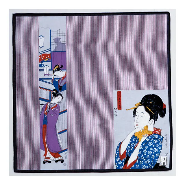 京彩 ハンカチ 浮世絵・寺社の襖絵や屏風絵に由来した意匠をもとに、捺染プリントで一枚一枚丁寧にプリントし、縫製されたハンカチです。絵画のように描いた、日本の伝統美を表現した美しい一枚です。 喜多川歌麿は江戸時代後期を代表する浮世絵師で、美人画の革新者です。 「美人大首絵」という女性の上半身を大きく描く構図を用い、顔の表情や仕草を通して内面の感情までも繊細に表現しました。 背景を省き、色彩や質感の美しさを際立たせる技法も駆使し、今もなお日本美術史に輝く天才絵師と評価されています。 サイズ・容量 約 43 × 43 cm 規格 綿 100%(ローン生地) 特記事項 生地の色はお使いのパソコンモニター・メーカーや機種の画面設定により、実際の商品の色とは異なってみえる場合がございます。予めご了承ください。 ご注文のタイミングによっては、注文確定後でも完売となる場合がございます。 生産国 日本