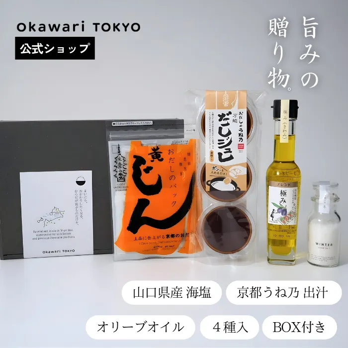 冬の食材を引き立てる「冬塩」、 年末年始のお吸い物や煮物にぴったりの「おだしのパック じん(黄)」、 手軽に本格だし料理が楽しめる「だしジュレ」、 そして、やさしく香るオリーブの風味が魅力の「ピュアオリーブオイル 極」。 素材のうまみを丁寧に引き出す、上質で落ち着いた味わいを詰め合わせました。 冬のご挨拶や、大切な方への贈り物、 お料理好きな方への特別なギフトにおすすめです。 ◼︎11個〜50個(目安)以上のご注文ご希望の場合 事前にチャットにてご相談ください お届け日希望、【10日前まで】にご連絡いただけますと幸いです 【商品説明】 冬塩 40g おだしのパックじん(黄)7g×5パック だしジュレ 65g×3個 ピュアオリーブオイル[極] 83g ギフトBOX(黒) ■冬塩40g 【原材料】 海水(山口県) 【原産国】 日本 【保存方法】 常温保存 【製造者】 株式会社百姓庵 山口県長門市油谷向津具下1098-1 ■おだしのパックじん(黄) 【原材料名】 かつおのふし(鹿児島県産)、かつおのかれぶし(鹿児島県産)、昆布(利尻島産)、乾しいたけ(大分県産) ■だしジュレ 65g×3個 【原材料名】 しょうゆ(本醸造)(大豆・小麦を含む)(国内製造)、お出汁(かつおのふし、かつおのかれぶし、うるめいわしのふし、昆布、乾しいたけ)、みりん、清酒、小麦醸造調味料、食塩、醸造酢、寒天 【表示すべきアレルギー項目】 小麦・大豆 【賞味期限】 製造から1年 ■ピュアオリーブオイル[極] 83g 【原材料名】 食用オリーブ油 (国内製造、スペイン) ※精製の原料に使用しているエキストラバージンオリーブオイルは、スペインで製造されています。 【賞味期限】 製造日から1年6ヶ月 【販売者】 株式会社for TEL:0364270595 ーーーーーーーー ◼︎プレゼントにおすすめ|okawari TOKYOの贅沢調味料ギフト おしゃれで上質な冬の贈り物をお探しの方へ。 料理好きな方へのプレゼント、グルメな方への贈答品、手土産にもぴったりです。 ◼︎贈り物・ギフトに人気の調味料セット 出産祝い、結婚祝い、引っ越し祝い、内祝い、快気祝い、誕生日プレゼント、母の日、父の日、敬老の日、クリスマスプレゼントなど、さまざまなギフトシーンにご利用いただけます。 上品な黒のギフトBOX入りで、贈り物にもそのまま使える仕様です。 ◼︎こんな方におすすめ ・料理好きな方へのギフト ・健康志向、オーガニック志向の方へのプレゼント ・おうちごはんを楽しみたい方への冬の贈り物 ・お歳暮・内祝い・お年賀・季節のご挨拶に ◼︎幅広い年代の方へのギフトにおすすめ ご家族やご友人など、年齢を問わず喜ばれる贈り物です。 お父さん・お母さん・ご両親・祖父母への感謝のギフトはもちろん、 ご兄弟・ご姉妹・親戚・ご友人・職場の方へのお礼やご挨拶にも。 男性・女性問わず贈りやすく、カップルやご夫婦のペアギフトにもおすすめです。