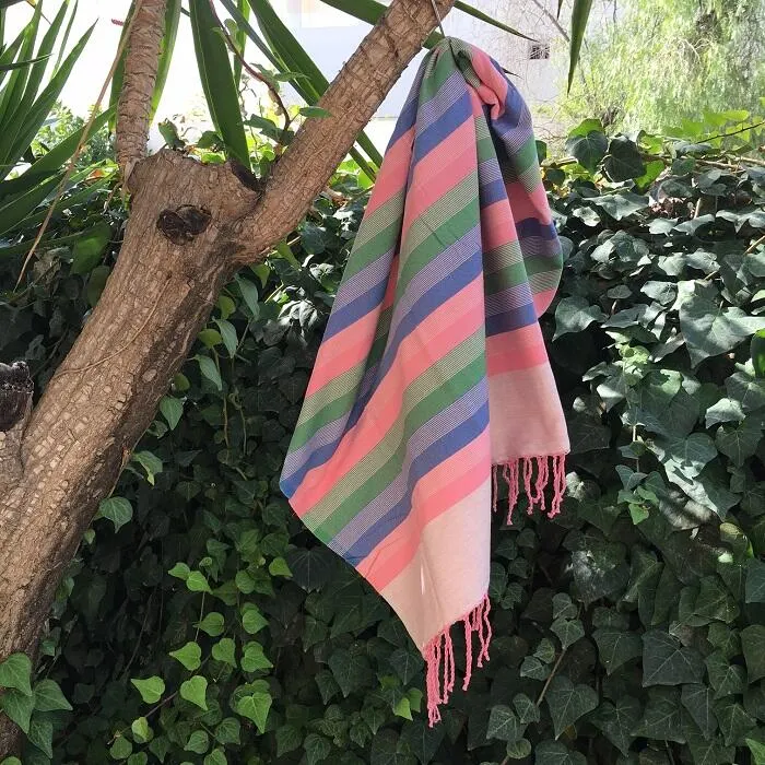 地中海フタ専門店、リゾートやピクニックシーンで活躍しますが、テーブルクロスやソファーカバー、ひいてはシーツ、首にまいてもかわいいコットン100%の布です