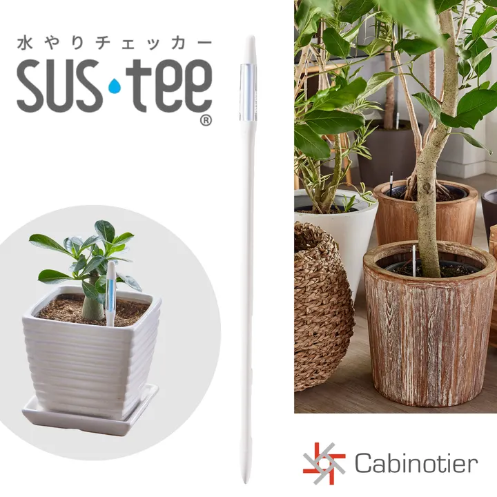 植物の水やりチェッカーSUStee(サスティー)は、水やりのタイミングを色の変化でお知らせ。白色は水やりの合図です。植物ライフをもっと快適に!
