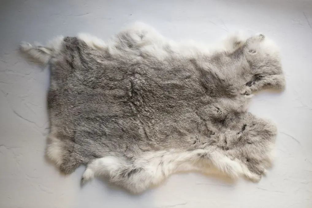 "高品質"のラビットファーです。毛足が長く柔らかい風合いです。 毛皮の裏面の処理も丁寧に行っています。 うさぎの毛皮のなかでも、縦幅50cm程度の大きいものを集めているので、大きめの椅子の座面に敷いていただいても十分な大きさがあります。
