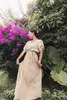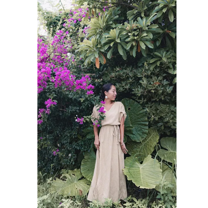 ブランドコンセプトのハグするお洋服の代表型。Hold You One Peace ぎゅっとハグしてくれているような優しさと温もりであなたの心と身体を包み込みます。年齢問わず着て頂けるベーシックかつ品のあるラップドレス。紐で大きさを調整出来るようになっており妊婦さんはもちろん、生まれたての赤ちゃんとお母さんをも一緒に包んでくれ、結び方を変えると羽織りにもなります。袖は女性が気にな る二の腕をすっぽり隠してくれるフレアスタイル & ココナッツのボタンフックで捲り上げるとヘルシ ーな肌見せで女性らしさも引き出してくれます。 特徴1 GOTS認証済みのオーガニックコットン生地をベンガラ(土)で染め、自然素材だけにこだわり、 使い古した洋服は土に埋めてもらうと地球に還る、地球循環型のお洋服です。 特徴2 どの型の洋服も2way~4wayで着ていただけるようデザインを工夫しており 1着あれば様々なコーディネートを楽しんでもらえます。 特徴3 お客様が普段お持ちのインナーを活用できるコーディネートをご提案することで サマーシーズンのみならず、春秋冬でもご愛用頂いています。 特徴4 GOTS認証済みのオーガニックコットン素材を使った高島ちち"みの生地は 使えば使うほどに柔らかくなりその人の肌に馴染むことが特徴で、お肌の弱い方にも 安心して着用いただいています。 特徴5 高島ちち"みは伸縮性のある生地の為、着れば着るほどに自分自身の身体に フィットしたサイズになってくれます。お客様からもこのようなお声を沢山頂いており、 フリーサイズ 展開でも生地の特徴を活かしそれぞれの体型に合わせた唯一無二の お洋服となっています。