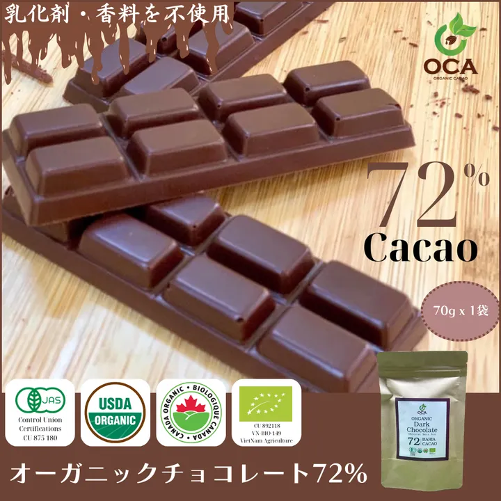 チョコレートを単なる甘い嗜好品としてとらえるのではなく、ベトナムのテロワールがもたらすカカオ豆の個性を十分に活かしたチョコレート。 チョコレートを食べることを、生活の豊かさへ繋げてもらいたい。新しい価値観を持つ大人たちへ。農園から製造までを一貫して行うFarm to Bar製法。芳醇な香りとフルーティーな酸味、じっくり訪れる奥深い甘み。香料・乳化剤など一切なしでこの風味、なめらかな口当たりは驚きのチョコレートです。有機JAS認証を取得し、すべてオーガニックの原料を使用しています。ベトナムの豊かな土壌が育むおいしさにこだわっています。コーヒーやお茶の時間のお供にはもちろん、ワインやウイスキーなどお酒との相性もとても良いチョコレートです。健康のためには毎日少しずつお召し上がりいただくと効果的です。 健康が気になる男性、オーガニック志向の女性へのプレゼントにもおすすめです。使用している砂糖(バームシュガー)は血糖値が上がりにくく、食生活をコントロールしている方にも適しています。カカオに含まれる、カカオポリフェノール摂取で期待され主なる効果は、「血圧低下」、「動脈硬化予防」、「老化防止」といわれ、近年注目されています。他にも「ミネラル」「鉄分」「デオブロミン」食物繊維 「リグニン」などの栄養成分が含まれています。貯めることはできないので、毎日少しずつ習慣的に摂取することをおすすめしています。 Natural makes Happy 自然はあなたを幸せにする: わたしたちOCA(オカ)のチョコレートは、ベトナム産オーガニックカカオとパームシュガーのみから作られたシンプルなチョコレート。 農薬や化学肥料を使わず、ベトナムの肥沃な大地の恵みを存分に受けたカカオの美味しさが活きています。 わたしたちOCAは、カカオの栽培はもちろん、その加工工程においても、なるべく自然に、時間を惜しまず、人や地球にやさしい商品をお届けしていきたいと考えております。 100年先もこの美味しいカカオとチョコレートが食べられることを願って。
