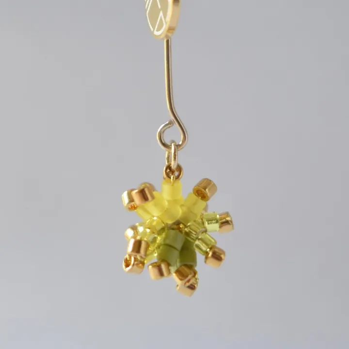 ハート形の三小葉に 小さな可愛らしい花をつけるカタバミ 果実はオクラのようなかたちをしており 熟すとパチンと弾けて種を飛ばすさまが おもしろく 見つけてはつまんで遊びました material K14GF ゴールドフィルド(ピアス金具)、SILVER925 金メッキ(イヤリング金具)、ガラスビーズ、金糸、真鍮、チタン、フェルト、シリコン *ゴールドビーズは本金メッキ加工を施したものを使用しております *取り付ける金具によって、使用している金属が異なります size 約10x36mm weight 約0.6-1.7g *取り付ける金具によって、重さが異なります *CACICOの商品は全て1点1点制作しているため、個体差があり、商品写真と差がある場合がございます。ご了承の上、ご購入ください。 *金属アレルギーの方はご使用をお控えください *受注生産のため、ご注文確定後1週間〜10日以内に商品を発送いたします