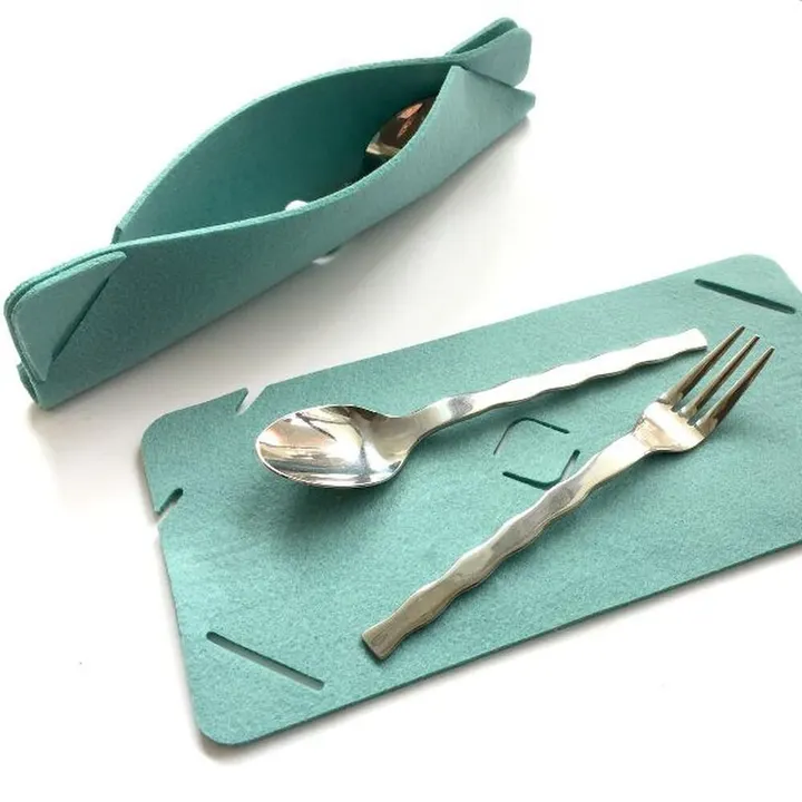 Module Designオリジナルのケーキフォークとティースプーンをティータイム用にセットした〈カトラリーセット〉をデザインしました。1枚のフェルトを差し込むとカトラリーケース、フラットにすればカトラリーマットとして使えます。セットしたところがちょっとしたカフェに。ウォッシャブルフェルトを使用しており清潔を保つことができます。 カトラリーはカトラリーの聖地といわれる新潟、燕の企業に製造いただいております。表面処理はこだわりのミラー仕上げ(磨き)で背面にはModule Designの刻印があります。4色から選べるカジュアルなセットは親しい友達へのプレゼントとしてもおすすめです。