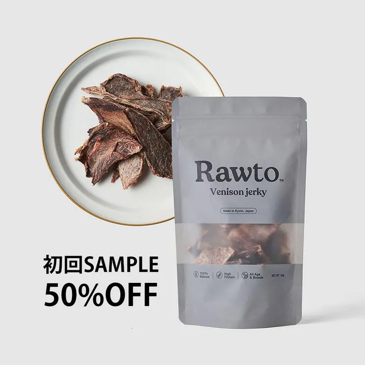 無添加 鹿肉ジャーキー|食べない犬におすすめの低脂肪ドッグフードおやつ 食べない犬もよく食べる。 愛犬がドッグフードを食べてくれない。そんなお悩みを持つ飼い主さんへ。 【無添加 鹿肉ジャーキー】は、国産・天然の鹿肉100%使用。食欲のないワンちゃんも夢中になる自然派おやつです。 もちろん食欲満点のワンちゃんも大喜びの鹿肉ジャーキー。 <商品の特徴> ・無添加・グレインフリー:香料・保存料・着色料 不使用。安心・安全。 ・鹿肉100%使用:京都舞鶴産の天然鹿を使用。低脂肪&高タンパクでヘルシー。 ・抜群の食いつき: 食べない犬もごはんが楽しみに。 ・手で簡単に割れる:シニア犬や小型犬にも与えやすい柔らかさ。 ・アレルギー対策にも:アレルゲンになりにくい鹿肉は敏感なワンちゃんにも最適。 <こんなワンちゃんにおすすめ> ・ドッグフードを食べてくれない ・食欲が落ちたシニア犬 ・体重が気になるワンちゃん(ダイエット中) ・アレルギーが気になる子 ・おやつやごほうびに“安心な素材”をあげたい ごはんタイムを「待ち遠しい時間」に 手軽で健康的、そして美味しい。 「食べない犬」を卒業させる第一歩に、ぜひ一度お試しください。 <Rawtoについて> 古都の豊かな自然に育まれた、希少な京都産天然鹿。 広大な野山を駆け巡り、滋味あふれる草木や木の実を食む鹿の肉は、凝縮された深い味わいが特徴です。 職人が一枚一枚丁寧に温風乾燥することで、鹿肉本来の旨味を最大限に引き出しました。 徹底した衛生管理のもと、ヒューマングレードで仕上げた安心の品質で、高タンパク、低脂質、豊富な鉄分とビタミンが、愛犬の健康を内側から力強くサポートします。 繊細な薄切りは、小型犬や老犬にも優しく、幼犬には細かく割ることで安心してお与えいただけます。 この鹿肉ジャーキーは、地域の生態系を守るサステナブルな取り組みから生まれた逸品。京都の恵みと、愛犬への想いを込めてお届けします。 ~愛犬が心から喜ぶ、そんなご褒美を~ 美味しさはもちろん、楽しみと健康も一緒に。 地球にも愛犬にも優しい、持続可能な鹿肉を厳選。 新鮮な素材、安全への配慮、そして栄養バランスへのこだわり。 それだけじゃないんです。愛犬だって、目を輝かせるような、 豊かな風味、美しい彩り、心地よい食感を。 未来の愛犬たちのことも考え、地球環境にも配慮した 鹿肉ジャーキーを、日本中の愛犬と、愛犬を慈しむ皆様へ。 <Rawto オリジナルジャーキー3つの特徴> ①京都府舞鶴産 鹿肉100% 完全無添加・人工添加物フリー・グレインフリー ②高タンパク・低脂肪・低カロリー・ビタミン類・鉄、亜鉛といったミネラル、アセチルカルニンも豊富 ③天然鹿肉の恵み、全犬種へ。幼犬から老犬まで、 健やかな毎日をサポート。 鹿肉は犬の祖先であるオオカミが好んで食べていた栄養バランスのよいお肉。他のお肉と比べてもアレルゲンになりにくく、高タンパクで脂肪分が少ないヘルシーなお肉で、理想のタンパク源です。 <安全と美味しさへのこだわり> 人も食することのできる、選び抜かれた鹿肉のみを使用。 無無添加・無着色を徹底し、自然の恵みそのままに、アレルギーのリスクにも配慮いたしました。 古都・京都府舞鶴市にて、熟練の猟師と連携し、地元で丁寧に仕留められた鹿肉を使用しております。 徹底した品質管理のもと、地元の工場にて、丹精込めて製造。 愛犬にも、そして飼い主様にも、安心と満足をお届けいたします。 商品名:犬用鹿肉ジャーキー 成 分:粗たんぱく質 66.1% / 粗脂肪 10.3% 水分 12.5% / 粗灰分 10.1% / 粗繊維 0.8%
